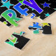 This exciting and vibrant birthday-themed jigsaw puzzle design has the message "HAPPY BIRTHDAY, JEFFREY" with the characters having a colourful rainbow spectrum inspired gradient pattern, along with a fun star shapes background pattern. A colourful puzzle like this might be used to send birthday greetings to somebody named Jeffrey. [~Z0000468]