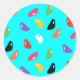 An aqua background with red, orange, yellow, green, purple, pink, black and white jelly beans...