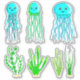A trio of cute jellyfish in green and blues ans a selection of seaweed.