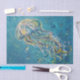 painting of a white and yellow jellyfish in blue water with a few bubbles swimming in blue water