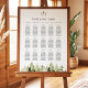 This seating chart features rustic watercolor pines and a bohemian handwritten font. This chart includes 15 tables of 11 for a total of 165 guests. Customise further by changing the size and adding additional tables as needed.