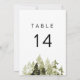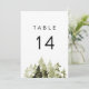 This table number features rustic green watercolor pine trees and a simple sans serif font. These table numbers feature the same graphics on the front and back and are the perfect addition to any mountain or forest themed event.