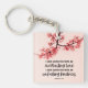 Inspirational quote scripture keychain depicts a nature photograph of a branch of pink flowers on a pink background. It features an encouraging Bible Verse Jeremiah 31:3, "I have loved you with an everlasting love, I have loved you with an unfailing kindness." Photo by Patrick Shaun.