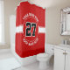 Jersey number, team and player name red and white sports shower curtain. It showcases the jersey number, the team and player names that can be changed on red background. There is a white and red band. Colours: red, white, black.