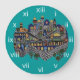 I took this photo of a handmade, hand painted Armenian ceramic plate with a colourful image of the Old City of Jerusalem. There is a teal background and the Roman Numerals are white.
