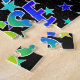 This exciting and lively birthday-themed jigsaw puzzle design features the message "HAPPY BIRTHDAY, JESSE" with the characters having a colourful rainbow spectrum inspired gradient pattern, in addition to a fun stars background pattern. A colourful puzzle like this might be used to send birthday wishes to somebody named Jesse. [~Z0000468]
