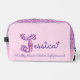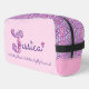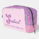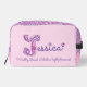 Pretty decorative letter J personalised girls name bag in shades of purple and pink use for toiletries or as a pencil or art supplies case. Customise with your own name beginning with J reads Jessica Wealthy, blessed. Intuitive, highly treasured. Background colour can also be changed to your own colour choice currently light pink. A perfect gift for girls and teens to take camp or to school. © Original sketched monogram art and design by Sarah Trett www.sarahtrett.com exclusively for www.mylittleeden.com