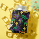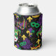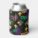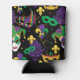 Mardi gras party can cooler patterned with carnival face masks, fleur de lis motifs and jester masks in purple, green and gold on black