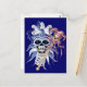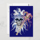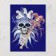 Mardi Gras style Jester skull is wearing New Orleans style mask in hues of blue and silvery white and holding a gold skull Jester sceptre.