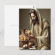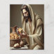 The atmosphere is peaceful and reflective, with Jesus' serene expression inviting observers into a moment of contemplation. The simple meal laid before Him, including bread and wine, captures the essence of humility and divine grace. The muted tones of the setting emphasize the significance of the spiritual message over material wealth.