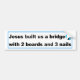Jesus built us a bridge with two boards and three nails bumper sticker with a picture of a cross.