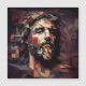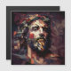 Cette carte est ornée de l'image de Jésus Christ. Elle est représentée par des formes géométriques complexes et des couleurs vives, avec des parties du corps décomposées et représentées sous différents angles. Cela crée une impression de mouvement et de profondeur, tout en ajoutant une touche artistique unique.