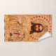 Jesus Christ in gold metal decorated with red stones. Holding a book with red cross. Close up photography.