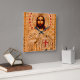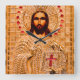 Jesus Christ in gold metal decorated with red stones. Holding a book with red cross. Close up Photography.