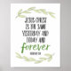 Beautiful brush script Calligraphy typography design with words from Hebrews 13:8, "Jesus Christ is the same yesterday and today and forever." Design is accented on top and bottom with green watercolor laurels.