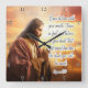 This inspirational clock face features Jesus Christ with hands clasped in prayer, looking downwards against a backdrop of a warm, softly lit sky. The powerful quote from "Romans 10:9" declares: "If you declare with your mouth, 'Jesus is Lord,' and believe in your heart that God raised him from the dead, you will be saved". Black numerals mark the hours, blending the core tenets of Christian faith with a daily reminder of salvation.
