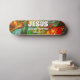 A stylish inspirational Christian skateboard that says JESUS GIVES YOU REAL PEACE. Design shows vibrant, psychedelic green abstract pattern with an inspirational Christian quote based on Philippians 4:6. Matching gifts available.