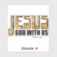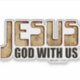 ►IMAGE: The name of “JESUS” in bold letters. ►COLORS: light brown aged, stained. ►TEXT: “JESUS, God With Us”. ►BACKGROUND: White / Marble. . . . ►Design appeals to men & women, all ages, Believers in Jesus Christ and the Christian Religion. (DESIGN by Paula Bragg)