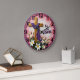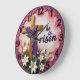 Celebrate the miracle of the resurrection with this high-energy and beautifully artistic wall clock. The central face features a high-definition graphic of a golden cross draped in a flowing purple shroud, surrounded by elegant white lilies and the script message "He Is Risen." While the artwork masterfully mimics the textured, heavy-stroke appearance of an impasto oil painting and the ornate border looks like hand-carved, purple-stained timber, this is a lightweight and durable graphic timepiece rather than actual wood or layered plaster. The deep navy-blue numeric markers provide exceptional contrast against the soft pink and cream textured background, ensuring the time is easy to read. This polished timepiece serves as an inspiring focal point for any room, offering a professional and meaningful self-gift for those wishing to showcase their faith with vibrant, high-quality spiritual art.
