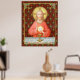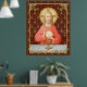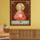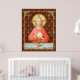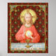 In this splendid image, Jesus sits at a table that is set for Passover and covered in a blue and white plaid cloth. He is clad in an eye-catching, soft red garment. It is Maundy or Holy Thursday and His Last Supper with His apostles. It is the moment at which He institutes the sacrament of Holy Communion or the Eucharist. + The figure of Jesus is isolated against a dark red background patterned with stylized artichokes in diamond shapes. The mood here is solemn. Lifting his eyes to heaven, Jesus raises his right hand in blessing. In his left, He holds up a large host, the Eucharistic bread, over the chalice filled with wine. In Latin--in a banderole beneath the scene--are the words of Consecration: “This is My Body… This is My Blood” (“Hoc est corpus meum… Hic est sanguis meus”). In remembrance of Him, at every Mass, the priest reenacts this sacred action turning ordinary bread and wine into Christ’s Body and Blood. + Image Credit (SAU 045): Antique devotional print of Jesus Instituting the Holy Eucharist, originally published in chromolithography by the Socièté de St. Augustin, Bruges, Belgium, late 19th century, from the designer’s private collection of religious ephemera.