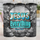 This image features a powerful spiritual declaration set against a grayscale, intricate backdrop. A central landscape with water and distant scenery is framed by an elaborate floral border, all rendered in shades of black and white. Overlaid in striking blue and yellow, the text "JESUS Everything" stands out, conveying a profound message of Jesus's central importance in one's life.