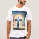 Proclaim your faith in Jesus as the Center of your life and the world with this beautiful Christian T-Shirt. The image shows the universe inside the Cross, and a brilliant sun set in a bright sky behind it.