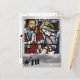 Front of this postcard, version five, features a beautiful framed stained glass design nativity scene with the following message, “Jesus is the reason for the season”. Also featured: three wise men in search of the Messiah, a camel, the star of Bethlehem and a Dove, symbolising the Holy Spirit.