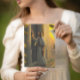 A bearded Jesus stands in a white robe, with long flowing hair, reaching out to touch a rectangular window on a stone door. His gentle knock awaits an answer, symbolising an invitation for spiritual awakening. The setting is a serene landscape during sunset, with vibrant hues of orange, yellow, and pink in the sky. The man stands on a stone pathway that leads up to the door, surrounded by lush greenery, including trees and grass. The door itself is set within a stone archway, and the entire scene exudes a sense of mystery and wonder.