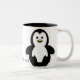 Cartoon penguin sits beside the words Jesus Loves Me placed on a two-tone mug.