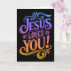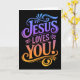 This bold and uplifting design features the message “Jesus Loves You!” in striking, vintage-inspired typography. Set against a deep black background, the lettering comes alive with a vibrant gradient that flows from cool blues and purples at the top to warm oranges and golden yellows at the bottom. Elegant flourishes and decorative swirls add a classic, handcrafted feel, while the strong contrast and radiant colour give the piece a modern, eye-catching energy. The overall design is both timeless and joyful—perfect for sharing encouragement, faith, and positivity.