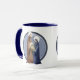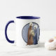 This ceramic ringer coffee mug with a deep blue interior and handle is adorned with a Nativity scene featuring Jesus, Mary and Joseph, with the slogans JESUS CHRIST LORD AND SAVIOR MESSIAH and THE ONLY REASON FOR THE SEASON.