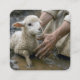 A delicate lamb in a mud puddle while being gently rescued by a shepherd's hands.