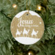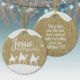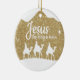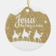 Jesus the King is Born, Religious Holiday Ceramic Ornament with gold sparkle glistening glow, three wise men on camels following the North Star capturing the Christmas magic and joy of a Christian season. On the back, the sacred writing, Luke 2:12 states, "And this shall be a sign unto you; Ye shall find the babe wrapped in swaddling clothes, lying in a manger" all in customizable text, ready for you create your favorite bible verse in festive devotional design hanging decorations. Order your Christ teachings testaments today and make your custom inspirational doctrine keepsakes extra special with divine passages of the word of our Lord! 🎄⛪️