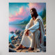 This serene portrayal of Jesus captures a tranquil moment of contemplation by a peaceful coastline. Clothed in flowing robes, He sits thoughtfully on rocky terrain, gazing at the vibrant horizon painted with hues of pink and gold. The gentle waves and rugged landscape create a harmonious backdrop, symbolising both strength and serenity. His expression radiates wisdom and compassion, inviting viewers to reflect on faith, peace, and the beauty of divine creation. This imagery serves as a timeless reminder of Christ's role as a source of comfort, guidance, and spiritual renewal for all who seek His presence.