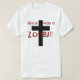 white T with cross and text