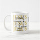 Stylish Christian coffee mug with some of the popular descriptions of the Lord displayed in a crossword format in bold black typography. In the background, the name of Jesus is repeated three times in gold coloured serif font. The design is repeated on the back. In the middle, there is placeholder text and a monogram, which are customisable, so you can add your name and initial or create your own text. This would make a great gift for birthdays, Christmas, and for anyone who loves the following inspirational quotes based on Bible Scripture: God will make a way in the desert; God always keeps His promises; Jesus is the Light of the world, and God is One who works miracles.