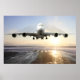 Photograph of a large commercial jet touching down on a runway that's still wet from the snow