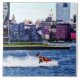 Jet skiing by the Colgate Clock in Jersey City with the NY skyline in the distance.