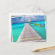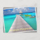 Postcard of a wooden jetty with some colourful boats and a thatched hut in the turquoise blue lagoon of the tropical, Pacific island Rangiroa, close to Tahiti and Bora Bora in French Polynesia with a white edge and in yellow the text 'French Polynesia'. The image is a bit rotated to create the illusion of it laying loose.
