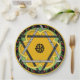 Cheerful original design featuring a a central mandala that intertwines a daffodil yellow flower with a polka dot Star of David all set on a spring green background, a border of red cherries & green leaves against black and a final border of Stangl yellow. Perfect for outdoor parties, the kids table for family get-togethers or luncheon plates.