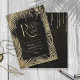 Opt for an Old Hollywood glam look by using the pieces in this wedding suite as shown, with jewels cascading off the diamond-encrusted palm leaves, or delete the jewel layers for a slightly more conservative look. This set features leaves in shimmering gold against a textured background the rich colour of black coffee. The wedding RSVP card shown here has a central frame surrounded by sparkling leaves, and an elegant Serif font to add to the romance. Easily enter your preferred text using the provided template. View the collection link on this page to see all of the matching items in this beautiful set or search ID830 to see additional colour options for this design.