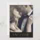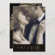 Opt for an Old Hollywood glam look by using the pieces in this wedding suite as shown, with jewels cascading off the diamond-encrusted palm leaves, or delete the jewel layers for a slightly more conservative look. This set features leaves in shimmering gold against a textured background the rich colour of black coffee. The wedding 'Save the Date' card shown here has an upper border of sparkling leaves, an elegant Serif font with the bride and groom's image on the reverse. Easily enter your own photo and wedding details using the provided template. View the collection link on this page to see all of the matching items in this beautiful set or search ID830 to see additional colour options for this design.