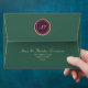 Modern, elegant, jewel tones plum purple and emerald green 5x7 envelope for wedding invitations with gold floral lace inside, return address and emerald green monogram at the top flap.