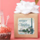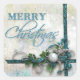 Richly layered design in deep teal and silver featuring satin ribbons, beads, a silver filigree star, diamond key, silver ornament and holly. Text is embossed with a touch of glitter. Background is textured and distressed with twinkle highlights. Note: Sculpted, engraved, embossed and dimensional effects, layered, aged or eroded appearance, textures and shadows achieved digitally. Actual product has a smooth surface.