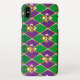 jewellery, background on Mardi Gras of purple and green rhombus, decorated gold lilies.