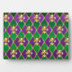 jewellery, background on Mardi Gras of purple and green rhombus, decorated gold lilies.