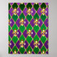 jewellery, background on Mardi Gras of purple and green rhombus, decorated gold lilies.