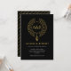 This elegant and sophisticated wedding invitation is a contemporary design, featuring the couple's initials elegantly presented in a stylish font, surrounded by a unique sculptural formation of concentric circles, reminiscent of a wire choker. The invitation is further embellished by a leaf accent positioned at the bottom centre, with a luxurious gold finish. To add a further touch of refinement, the reverse side of the invitation features the couple's names displayed in a diagonal pattern in gold against a black background. This invitation will be sure to impress your guests with its modern, yet timeless design.