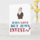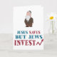 A funny saying - "Jesus saves but Jews Invest". With grunge style letters and an arrow pointing up representing some kind of successful investment. This is a humourous Jewish twist for the phrase "Jesus saves", suggesting Jewish abilities with money and finance. This item can be a great gift for your Jewish friend at various Jewish Holidays and occasions.