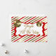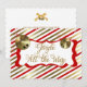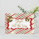 Jingle All the Way Christmas holiday greeting invitation card features a background of red, white, and gold diagonal stripes, old time jingle bells, a red and white banner, and text that reads Jingle All the Way! The back features a small gold bow with two jingle bells with an area you can add your text message and name(s). We have matching postage, stickers, return address labels, and envelopes.